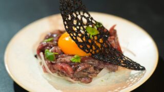 カウンターにある囲炉裏に炭を組んで、ゆったりと焼肉を楽しめる店。肉はオーナー自らが仕入れ、加工まで行うこだわり。炭火で焼き上げる肉は、遠赤外線効果でじんわり火が入るため、ふっくらと焼き上がり旨味が引き立つ。看板メニューは、県産和牛を使用した『炭火炙りユッケ』1408円。赤身の味わいが強く感じられ、上にのった炭のお菓子が風味のアクセントに。
