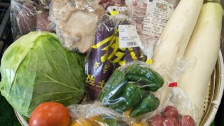 地元・佐土原産をはじめ西都・児湯産、オーナーが直接市場から仕入れた旬の野菜や果物が数多く並ぶ。近隣の生産者が直接持ち込むため、採れたての新鮮な食材を生産者価格で購入できるのも魅力。大根や葉物野菜など商品は日によって入荷がかわる。猪肉や鹿肉などスライス済みのジビエ加工品もあり、リピーターが多い。ボリュームたっぷりの店内手作り『からあげ弁当』『チキン南蛮弁当』各600円は数量限定で販売。