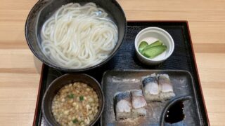 平屋をリフォームした隠れ家空間で、ゆったりとうどんをいただける店がオープン。人気メニューの『釜揚げうどんと炙り魚寿司2個セット』960円は、サバ節のダシをしっかり効かせたしょう油ベースのつゆと、讃岐から取り寄せた小麦粉で作る自家製麺が相性抜群。揚げたてうどんの美味しさを、つけ汁で堪能しよう。セットの魚寿司は、新鮮なサバを軽く〆て、提供前に香ばしい焼き目をつけて提供。
