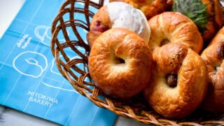 店内工房で丁寧に焼き上げるベーグルをメインに提供。人気の『クロワッサンベーグル』340 円は、外はクロワッサン生地でサクッと香ばしく、なかはもっちりしたベーグル生地が堪能でき、シンプルな逸品から、デザート系やおかず系のベーグルまで11 種揃う。北海道産の小麦粉「ゆめちから」を使用した『HITOKIWA食パン』540 円は、耳までやわらかく、噛むほどに甘味が広がる定番商品。イートインスペースもあり、焼き立てが楽しめる。