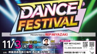 宮崎を拠点に活動するダンススクール 「REP MIYAZAKI」主催のダンスフェスティバル。 県内高校のダンス部やエイサーのほか一般チームも参加し、白熱のダンスパフォーマンスを繰り広げる。今回はさまざまなジャンルで活躍する choreo grapher 3名が競い合うコンテストもあり、見応えたっぷり。司会は木村つづくが担い、秋の西都が盛り上がるダンスの祭典は必見!会場では焼酎等ドリンクの販売やキッチンカーが並ぶ。(予備日11月9日(日))