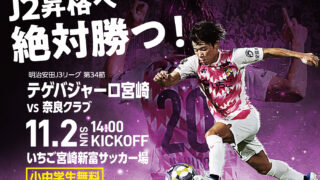 11月2日㈰に「明治安田J3リーグ 第34節 テゲバジャーロ宮崎 vs 奈良クラブ」が開催。今節は「ドコモMAXマッチデー」!チケット(小中学生無料)などの詳細情報は→Webサイトをチェック!【特別企画】JAみやざき Presents 宮崎...