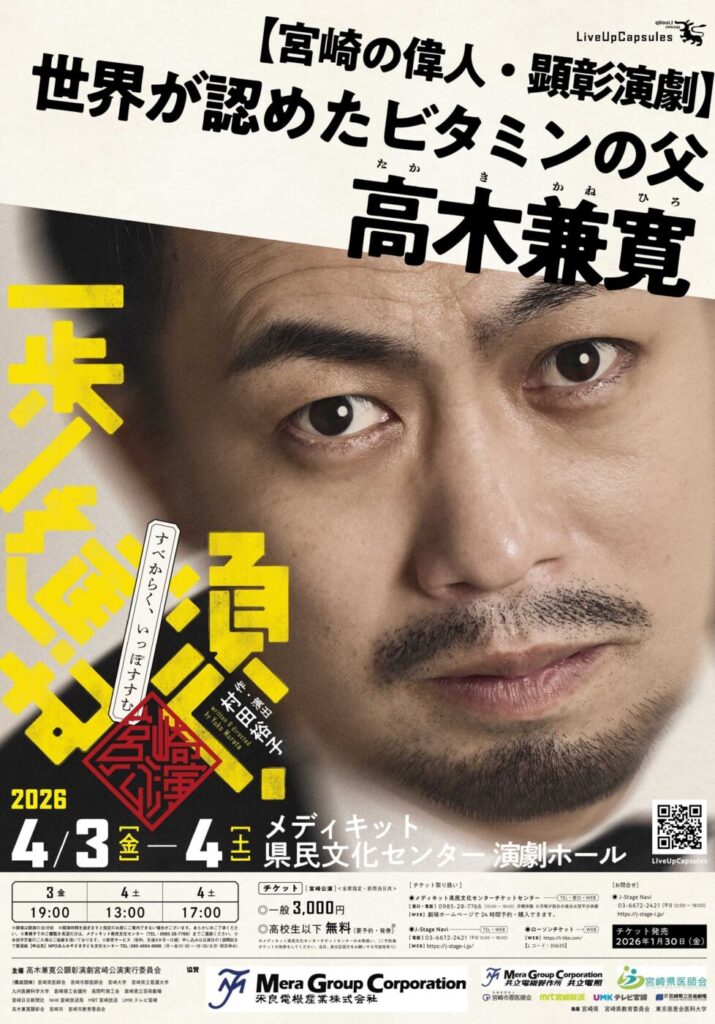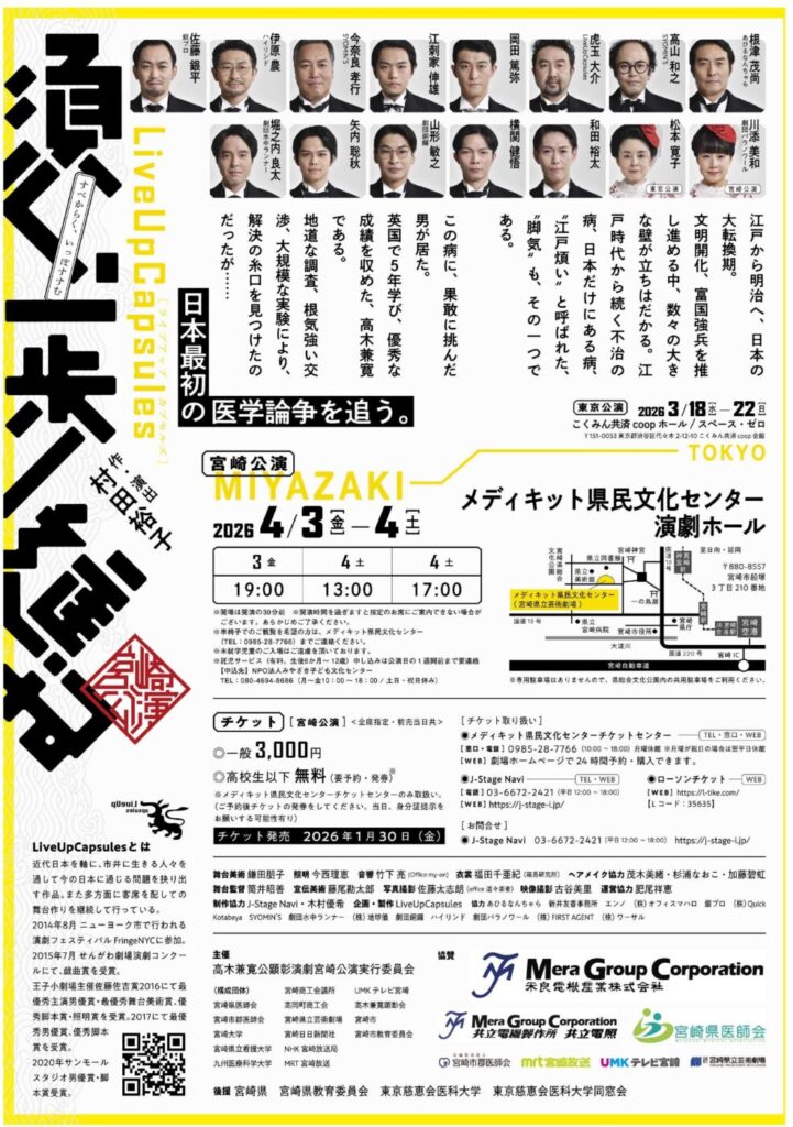 宮崎が誇る偉人・高木兼寛の偉大な功績を演劇を通して広く後世に伝えるため、脚気をめぐる日本最初の医学論争を中心に兼寛の半生を描いた顕彰演劇を上演。2024年3月に劇団・LiveUpCapsules(ライブ・アップ・カプセルズ)が東京公演で成功を収めた作品の宮崎公演。1849年、現在の宮崎市高岡町穆佐に生まれ、明治時代、当時難病といわれた「脚気(かっけ)」の予防法を確立。のちに東京慈恵会医科大学創設や日本初の看護学校の創設など、日本医学発展のために数々の偉業を成し遂げた。兼寛の研究は後のビタミンの発見にもつながり、“ビタミンの父”と呼ばれている。親子での観劇もオススメ。