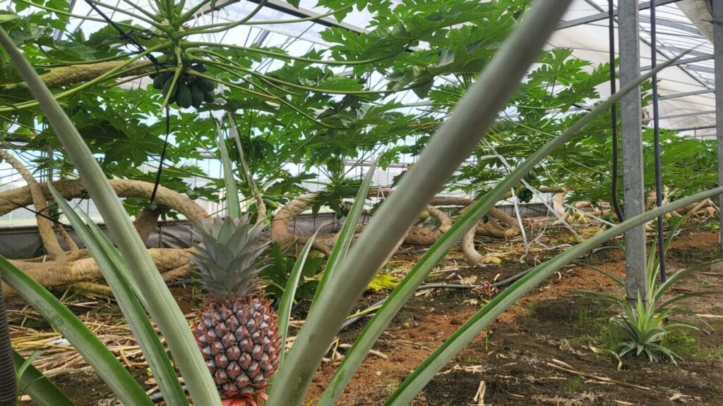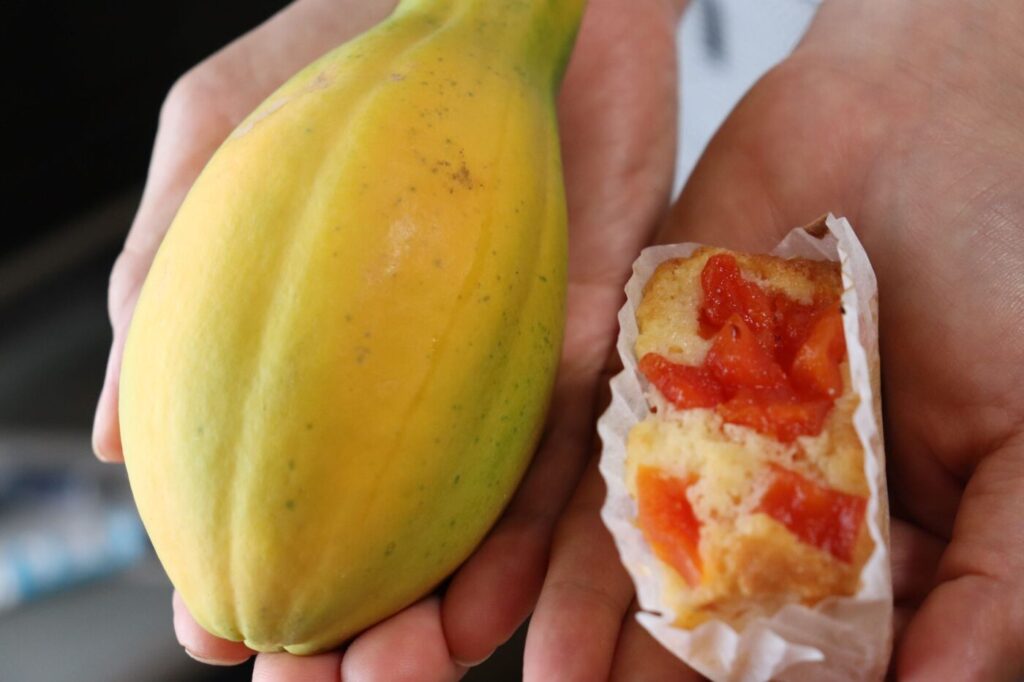 パパイア農家を始めて20 年、念願のスイーツ製造をスタートさせたオーナー・横山明美さん。「パパイアをはじめ旬の果物の美味しさをスイーツで楽しんでもらえれば」と、自家農園で栽培しているバナナやパイナップル、スモモをトッピングした手作りのパウンドケーキが完成。『パイン』『スモモ』『パパイア』『バナナ』『栗』各220 円。現在は、宮崎市交流プラザきよたけ四季の夢で数量限定で販売中。直販などは問合せを。