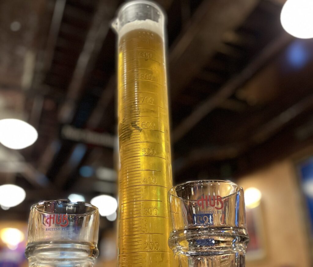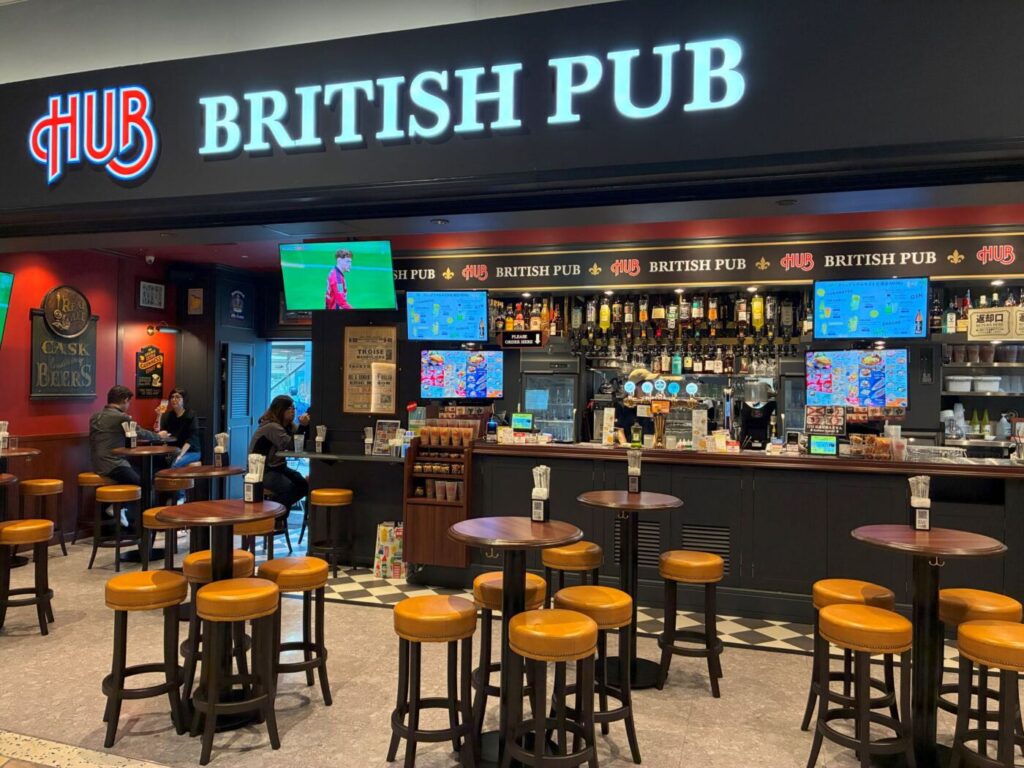 お酒を飲みながらスポーツ観戦が楽しめる、英国スタイルのパブ。イギリスの定番ビール『ハブエール』550円~は、心地よい苦みとコクで、ジューシーな肉厚真ダラを使用した『フィッシュ& チップス』1200円と相性抜群。日向夏リキュールと日向夏ジュースをビールで割った『HUB日向夏ビア』750円~をはじめ、同店限定のオリジナルメニューも豊富に揃う。16 時~のお得なハッピーアワーも開催中!