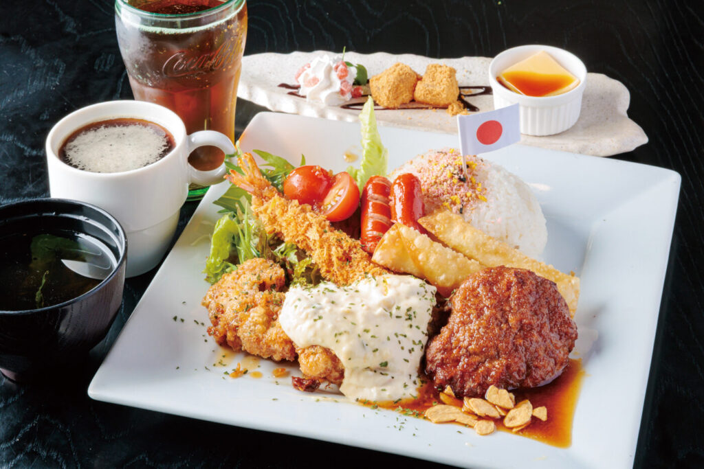 全個室の昼も夜も人気のダイニング。看板メニューの『大人のお子さまランチ』は、手づくりでふわっふわのハンバーグにチキン南蛮、エビフライ、ウインナー、チーズフライが載って食べ応え抜群。ご飯、サラダ、スープ、デザート、ドリンクバーがセットになってお腹も心も大満足。