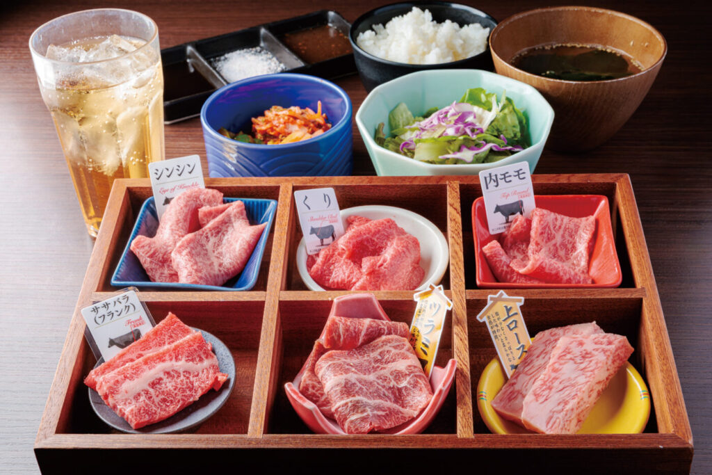 オーナー自ら目利きし、一頭買いするという宮崎牛の希少部位をお得に美味しく味わえる人気店。オススメはランチ限定の美しき麗しき松花堂焼肉ランチ。宮崎牛の希少部位6種を日替わりで楽しめ、サラダ、キムチ、ご飯にデザート、ドリンクまでついて新年会やランチ初めにピッタリ!