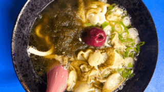 関西から移住してきた夫婦が営む店。看板メニューは、牛のホルモンを低温でじっくりと揚げた「油かす」がのる『かすうどん』600円。イワシの削り節から取ったダシは、風味豊かで旨味たっぷり。「 油かす」は大阪から取り寄せたものを使用。砂肝が入った大阪名物『ズリやきそば』600円も人気。18 時以降は『鳥タタキ』500円や『日替り酒の肴』300円~など居酒屋メニューも提供。