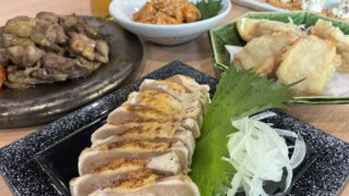 落ち着いた雰囲気の中で地鶏料理がいただける店。鮮度と素材にこだわった逸品がいただける。鶏肉は、西都市の久米田地鶏を使用。人気の『刺盛りむねたたき』980円は、食べると脂のさっぱりとした甘みが口いっぱいに広がる。そのほか、中・大のサイズが選べる『もも炭火焼き』1500 円~や、鶏皮を旨辛韓国ダレで漬けた『鶏チャンジャ』580 円など、ビールや焼酎にも合うメニューを約40 種提供。