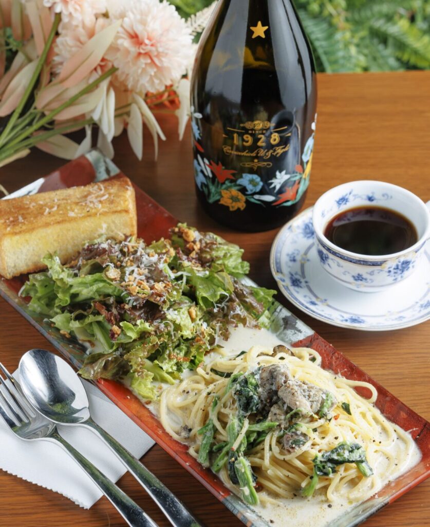 花に囲まれた空間で食事やデザート、ドリンクが楽しめる。店の看板メニューは地鶏やユズ胡椒の宮崎料理をアレンジしたパスタ。ペペロンチーノの辛味をクリームでマイルドにした個性豊かな味わい。シンプルなドレッシングのサラダ、バケットも一緒に味わって。