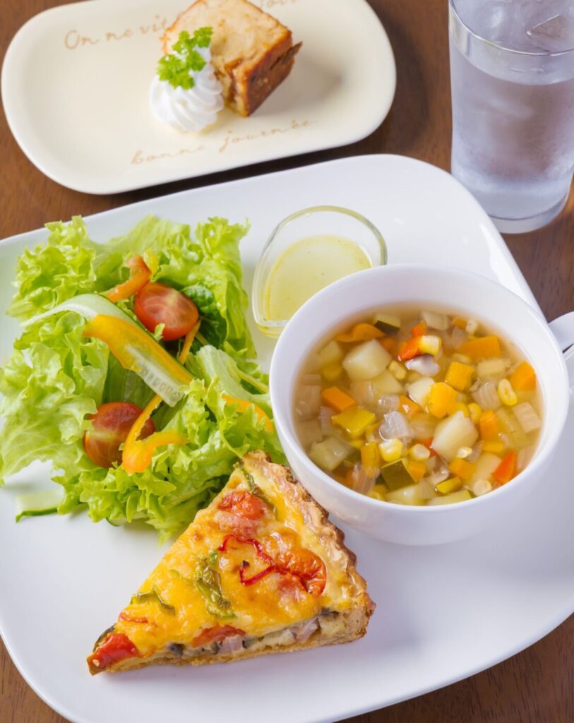 県産の果物を使って季節感あふれるタルトを手掛ける店が、親交深い農家から仕入れる野菜を使ったキッシュをランチで提供。取材時は、トマトやナスなどの夏野菜のキッシュ。有精卵で野菜をとじ込めて、さっくりタルト生地が美味。野菜ぎっしりのスープも大満足!