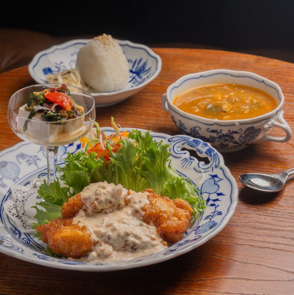 創業約40年、人気の「やきとり大将」併設のカフェが常連客からの要望でランチを再開。こだわり満載のチキン南蛮は、鶏モモ肉をジューシーに揚げて自家製の熟成酢に丁寧に漬け込む。歯応え抜群のタルタルをたっぷりかければ酸味、旨味、甘味のバランスが絶妙。
