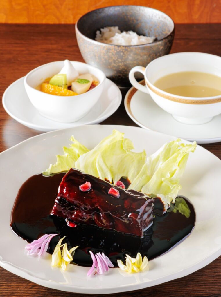 本格的なオリジナル中華を、メインが選べるランチで提供。なかでも綾豚の肩ロースの塊を低温調理でじっくりやわらかくしたステーキ風は、見た目のインパクトもある一品。黒酢を使ったソースは酸味のなかにコクがある味わい。ガッツリお肉を食べたいときにオススメ。