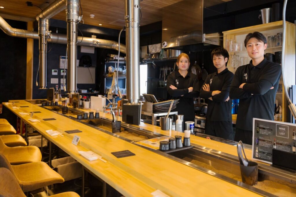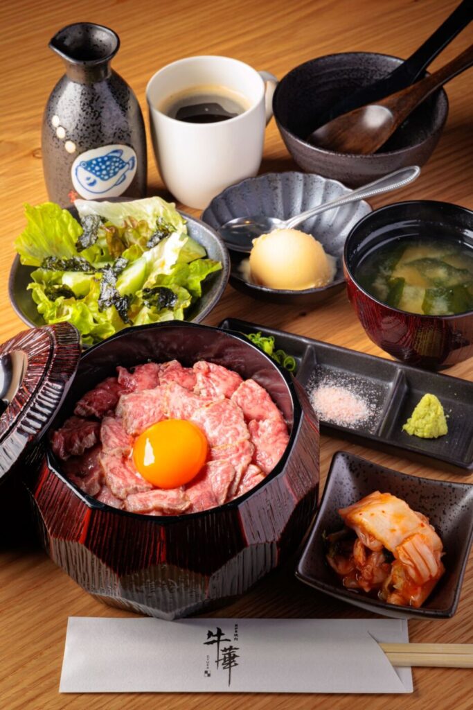 カウンターの囲炉裏がオシャレな焼肉店。5食限定で提供する『宮崎牛ひつまぶし重』は、肉の味が濃い宮崎牛の内モモ肉を使用。仕上げにまとわせた炭火の香りや、甘味のあるタレと黄身の濃い玉子と相まって、ひと口でいくつもの旨みを堪能できる。〆にだし茶漬けも味わってみて。事前予約もOK。