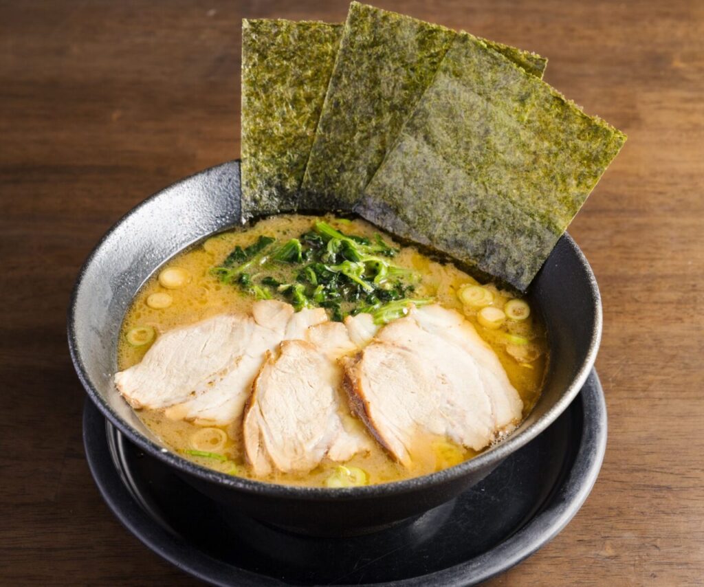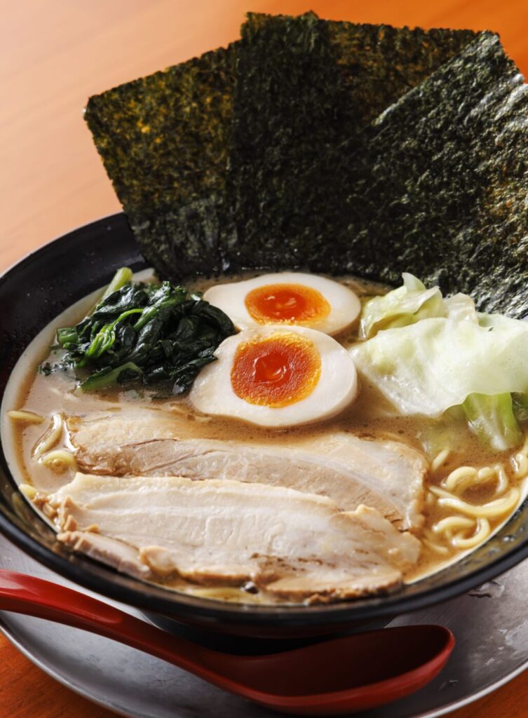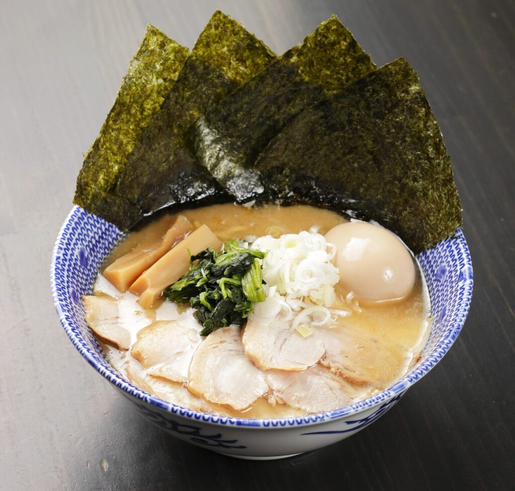 パンチのある豚骨スープに、家系の本場・神奈川県「四之宮商店」の中太麺。増量した海苔とチャーシュー、味玉の「オールスターズ」が載れば食べ応えは絶大に。麺の硬さ、味の濃さ、油の量は選択可。豊富なトッピング、玉ネギや酢などで味変を楽しみつつ最後まで味わって!