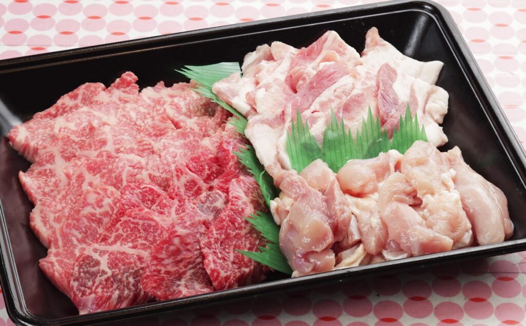 創業68 年を誇る老舗の精肉専門店。A5 ランクの宮崎牛をはじめ、地鶏や豚などを目利きの職人が厳選。新鮮で安全な肉と温かなおもてなしに、焼肉店や飲食店の卸から一般客まで常連多数。オススメはやわらかく、旨味と甘味たっぷりの黒毛和牛3点セット!好みのタレでお腹いっぱいご堪能あれ。