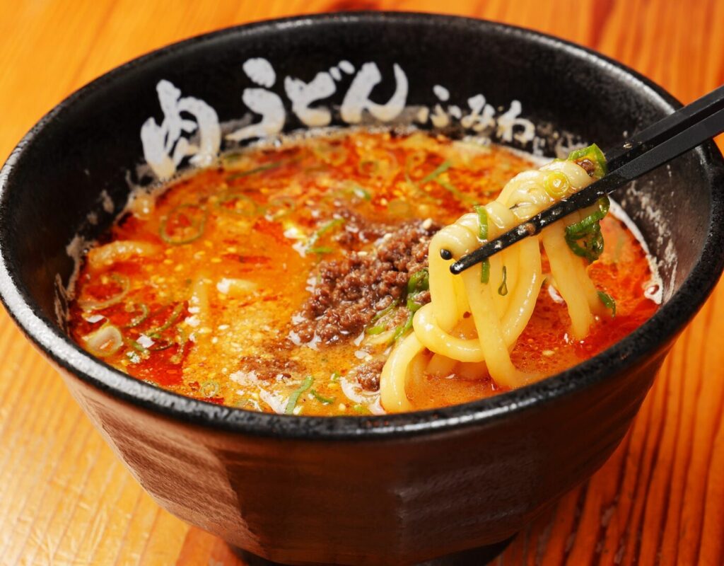 炒めた豚ひき肉に都城産の赤味噌、カツオやイリコでとった出汁、豆板醤を加えた旨辛スープは味噌の風味と刺激的な辛みが後引く旨さ。麺は香川県から直送される特注の生讃岐うどんを茹でたてで提供するのでツヤツヤなめらかだ。チーズのトッピングがオススメなのでぜひチケットを利用して!