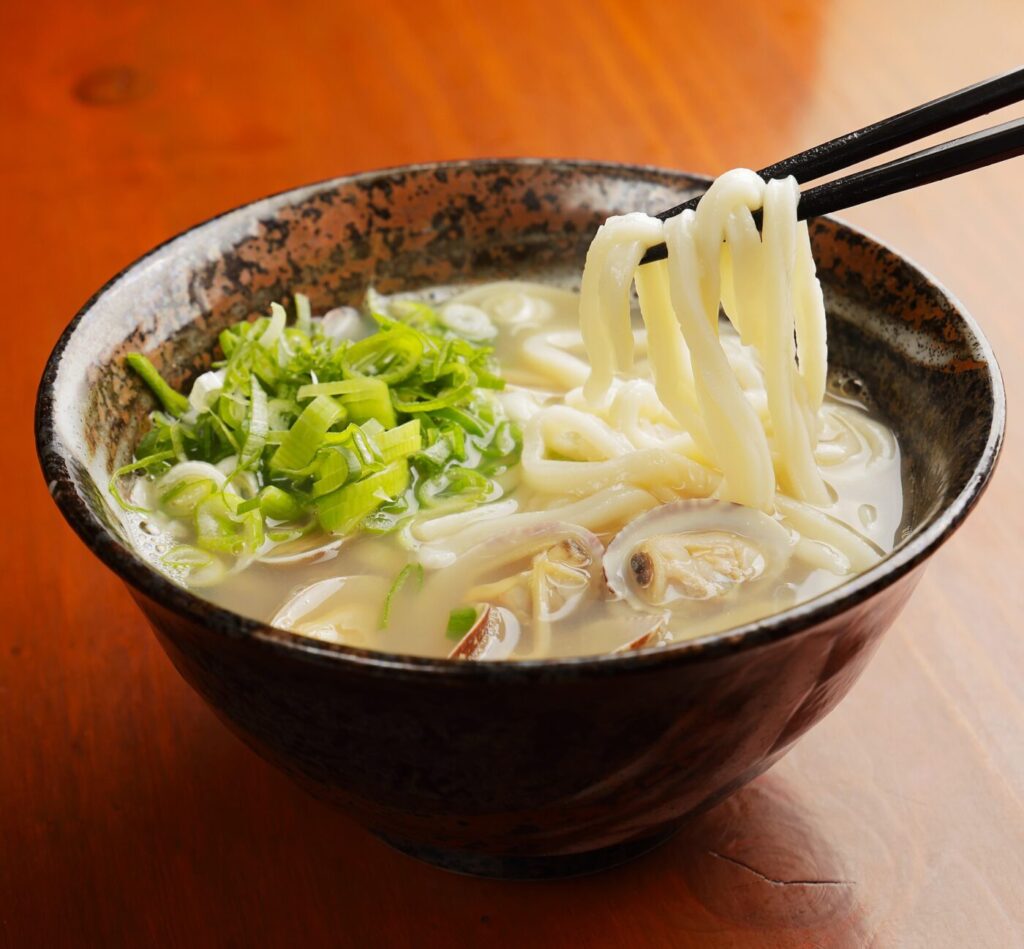 鍋焼きうどんといえばの同店で、驚きのメニューを発見!イリコやカツオ節、コンブから取る無添加のやさしい出汁に旨味たっぷり、磯の香り漂う殻付きのアサリと濃厚なバターをプラス。なめらかなコクが絶妙で、新富町産の小麦粉で毎朝打つ、ほどよいコシが自慢の自家製麺にもよく合う。