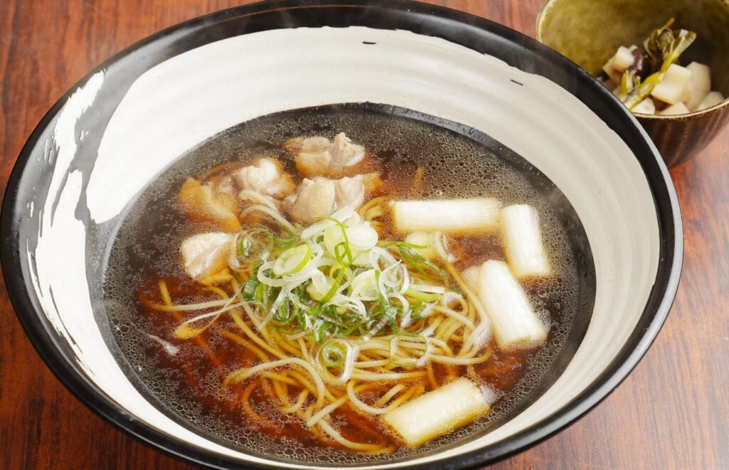熊本県の阿蘇や菊池産のそば粉をブレンドした手打ちの十割そばを提供。つゆは、6種の節類に昆布を使ってしっかり出汁を取り、しょう油などで少し甘めに味付け。おいしいと飲み干して帰る人が続出。炭火で焼いた鶏肉がつゆにとけ込んで、じんわり滋味深い味わいに。
