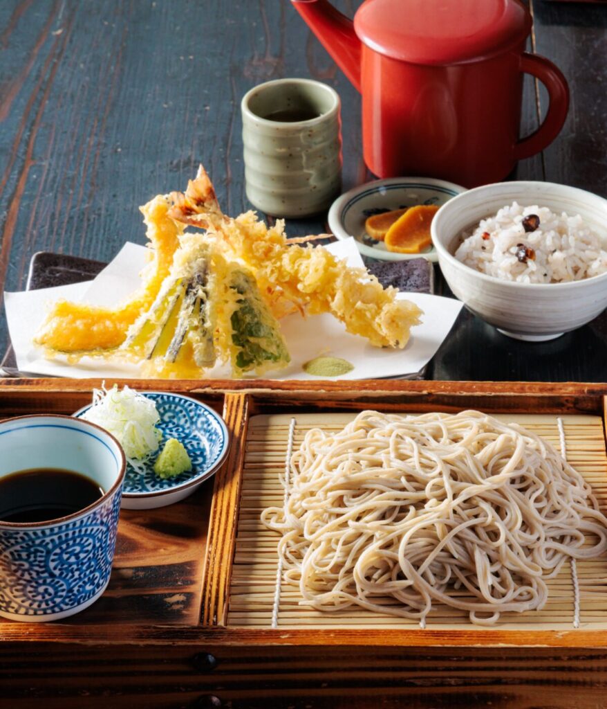 綾の名水を使い毎朝手打ちする十割そばが人気。かけとせいろどちらも選べるなか、オススメは香り豊かなせいろ。カツオなどの数種の節類でとった出汁を使ったすっきりした後味のつゆと打ちたてそばのマリアージュに、ハマる常連続出。揚げたての天ぷらとも相性抜群だ。